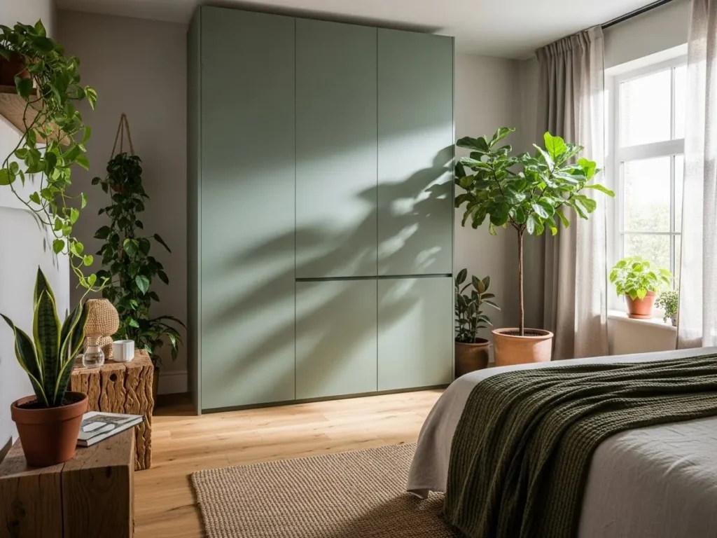 Wardrobes with sage green, moss, or forest-toned finishes blend beautifully into this nature-inspired atmosphere. Textured panels, woven baskets, and soft lighting reinforce the earthy theme while maintaining modern functionality. Plants placed near the wardrobe add life and create a seamless connection between storage and decor. This trend is ideal for homeowners who want a rejuvenating master bedroom that supports wellness and a natural lifestyle.
