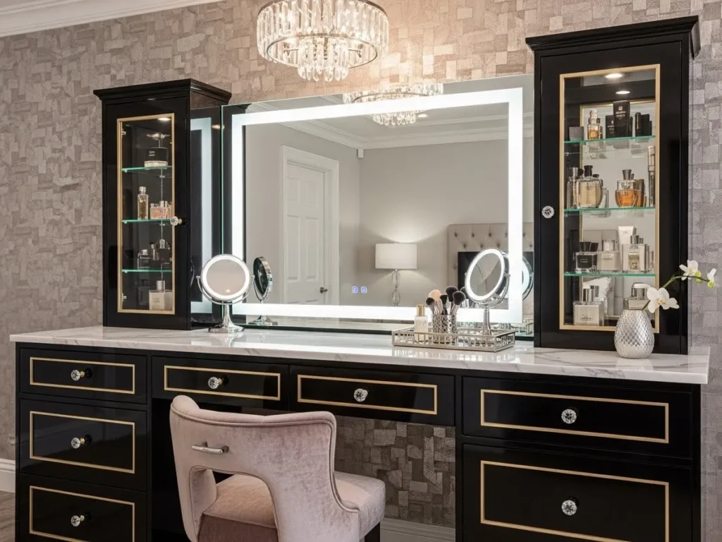Wardrobes accompanying a vanity area often include dedicated accessory drawers, jewelry compartments, and pull-out organizers that keep everything accessible. Soft lighting and carefully selected finishes tie the bedroom and vanity together, creating a polished, cohesive look. The elegance of the vanity elevates the entire suite, making it feel luxurious and thoughtfully designed. This idea is ideal for those who appreciate beauty, convenience, and personal pampering zones within their master bedroom.