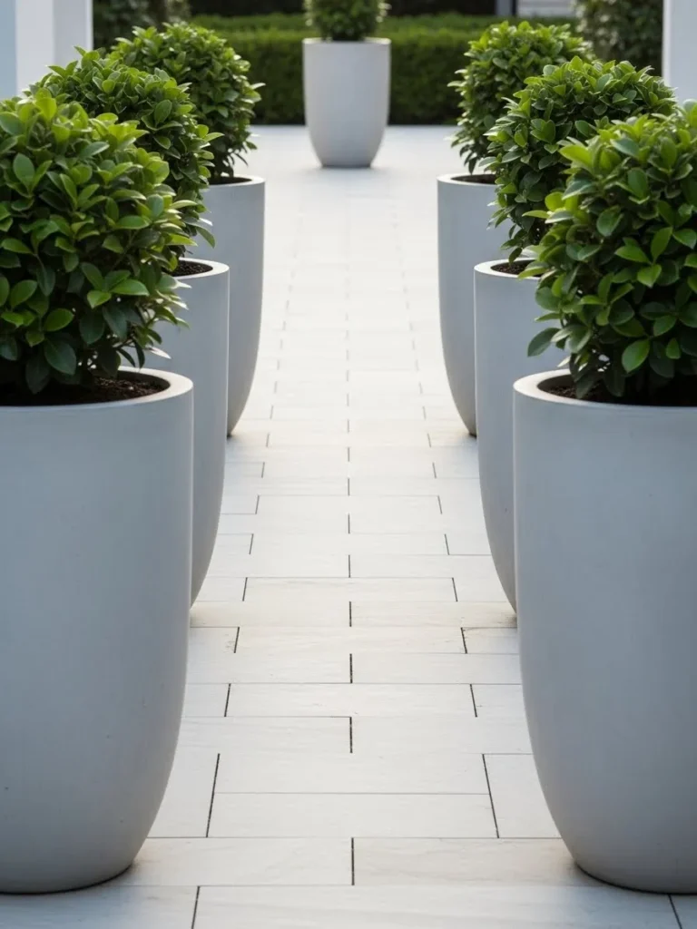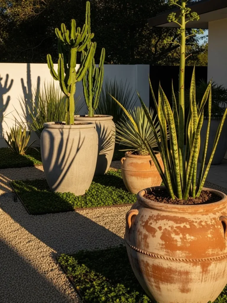 Oversized containers are one of the best investments you can make in a garden because they set long-term structure. Larger pots don’t dry out as quickly, they allow roots to grow deeper, and they can hold statement plants that define an area. Many people underestimate how transformative one tall pot can be. Whether you choose a large ceramic planter, a matte concrete cylinder, or a rustic terracotta urn, the size alone creates importance. Place oversized pots at corners, near seating areas, or beside steps to add weight and visual stability.