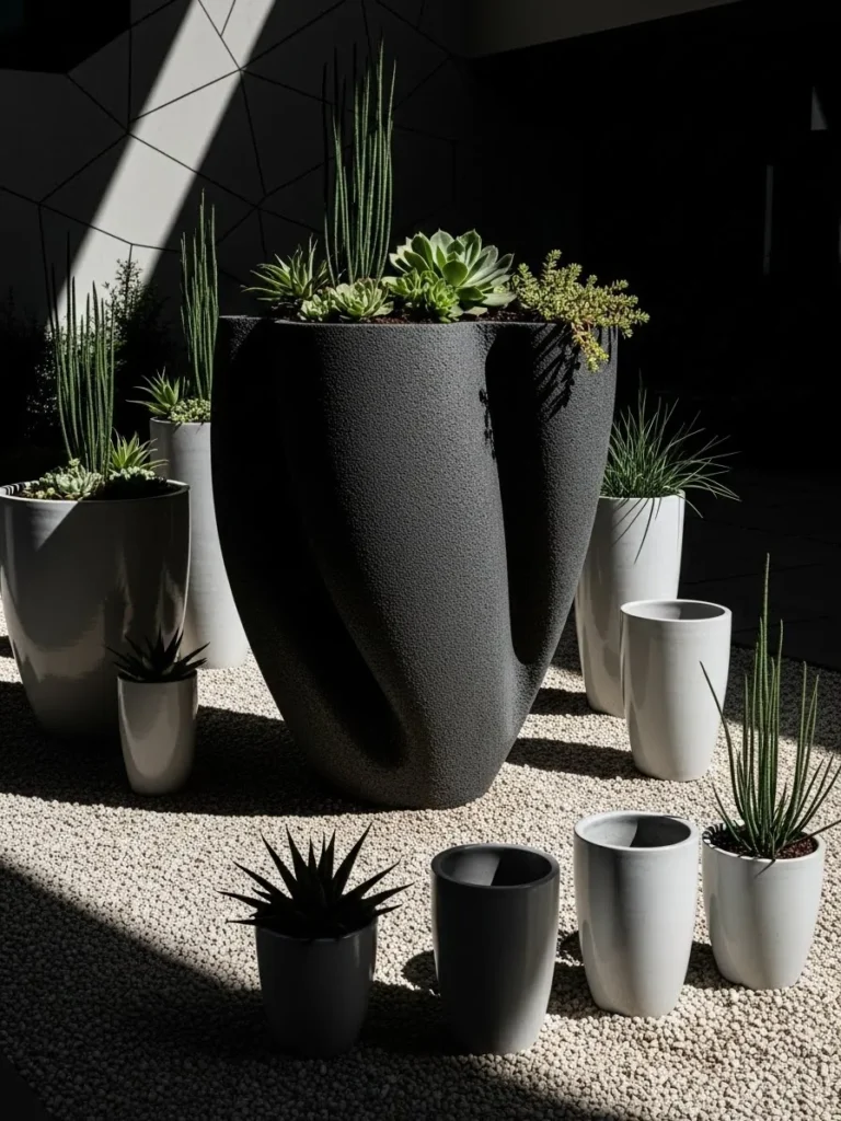 A single high-impact pot can become the center of attention when paired with simpler containers. Statement pots often feature bold shapes, unusual textures, or striking colors. Instead of using several bold pieces, one standout pot surrounded by calm background pots creates a pleasing balance. This technique is used often in professional design because it directs the eye exactly where you want it to go.