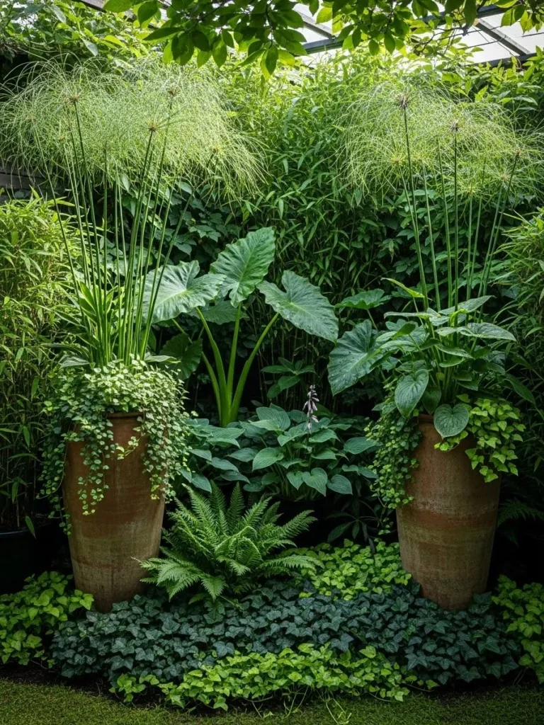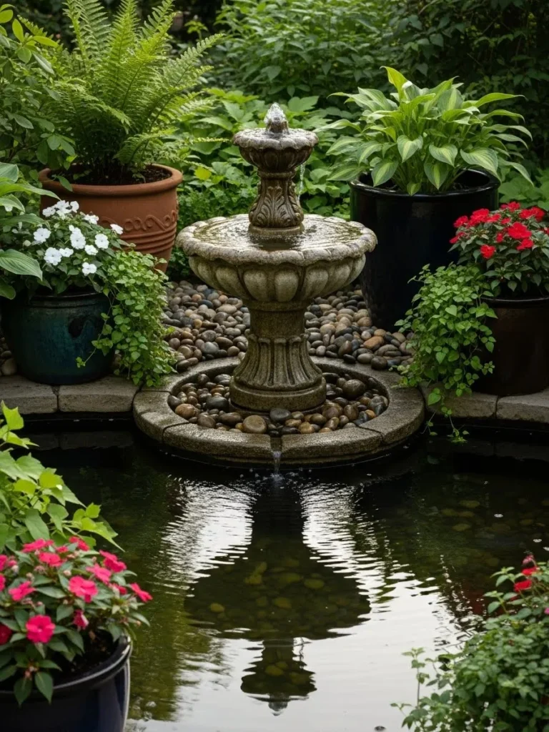 Even a small water bowl or tabletop fountain becomes more meaningful when framed with plants. Pots help soften the edges of water features and make them feel integrated into the landscape. When placed nearby, the plants reflect subtly in the water, adding depth and movement. This idea works well in small gardens because it brings multiple sensory elements—sound, greenery, and reflection—into a compact space.
