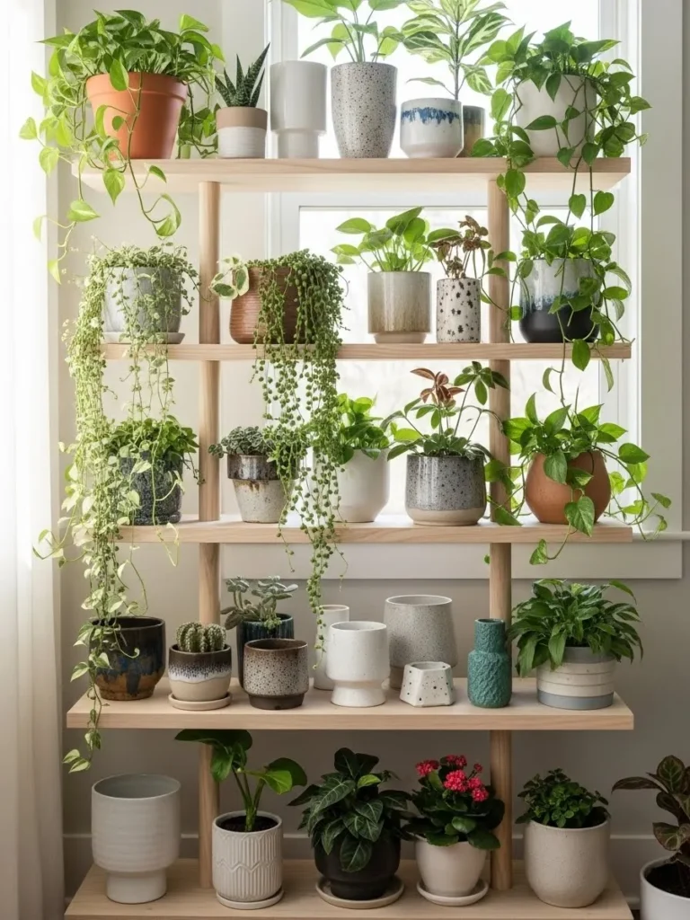 By using stands, crates, and stepped plant shelves, you can create a multi-level display that feels dynamic and layered. This technique works especially well with small and medium pots, which might otherwise get lost at ground level. The different heights create a natural backdrop effect, allowing trailing plants to spill down from above while compact plants fill the lower levels. Multi-level potscapes elevate simple plants and make the garden feel more curated.