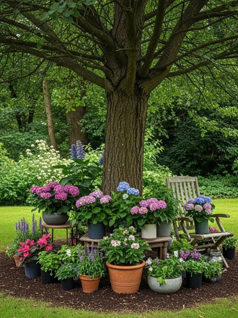 Placing pots around the base of larger trees enhances the transition between trunk and ground. It creates a layered effect that feels rich and complete. Choose shade-tolerant plants when working under trees and use pots in different heights for a more organic look. This technique softens otherwise harsh roots and makes tree bases feel intentionally designed rather than neglected.