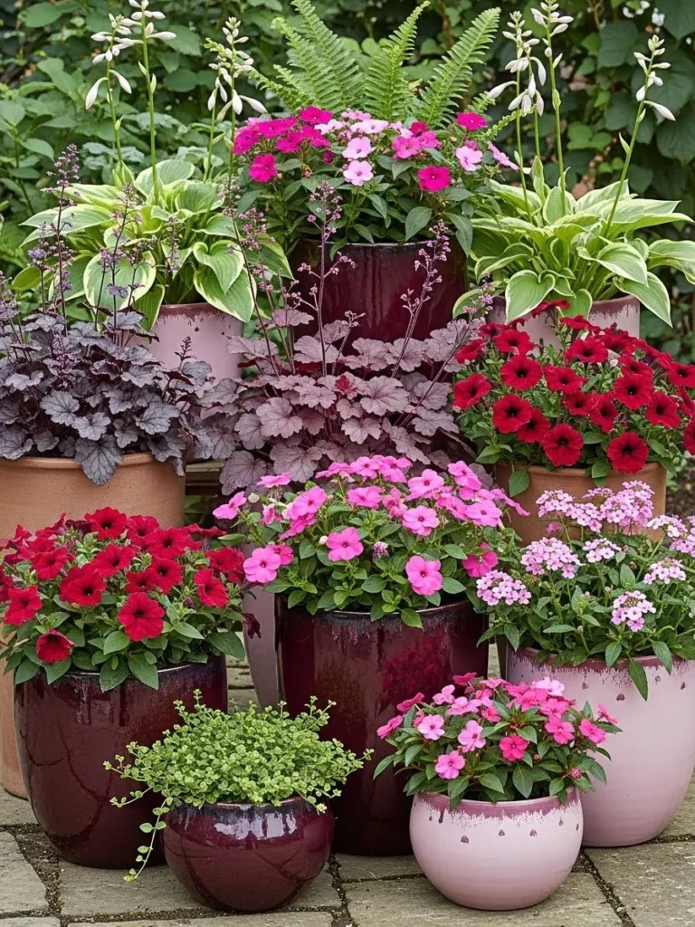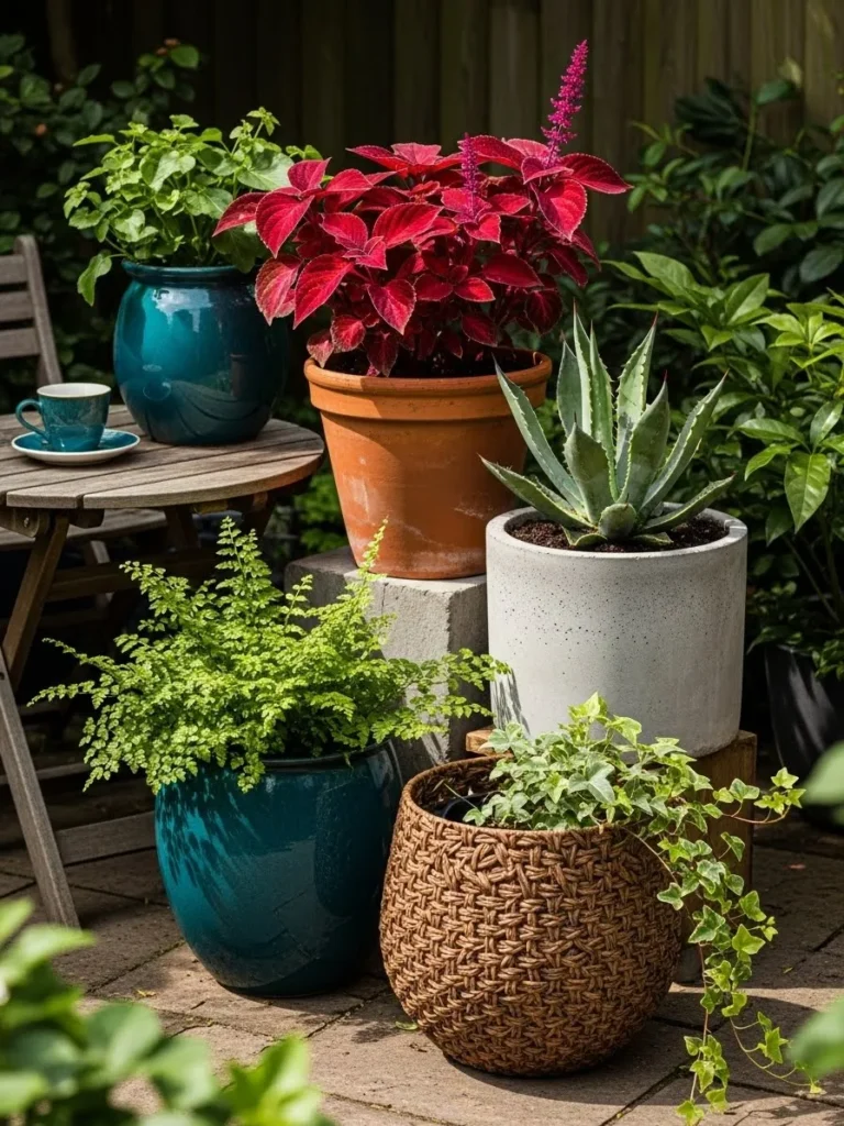 When you theme your pots around one color family, the entire space appears more polished. This doesn’t mean everything has to match exactly. You can mix burgundy tones with soft pinks, or deep greens with white variegation. Keeping your color palette tight helps tie everything together, especially if your garden feels scattered or busy. After years of experimenting with different palettes, I’ve found that color-grouped pots create the simplest path toward a clean, intentional look without needing high-maintenance plants or formal layouts.