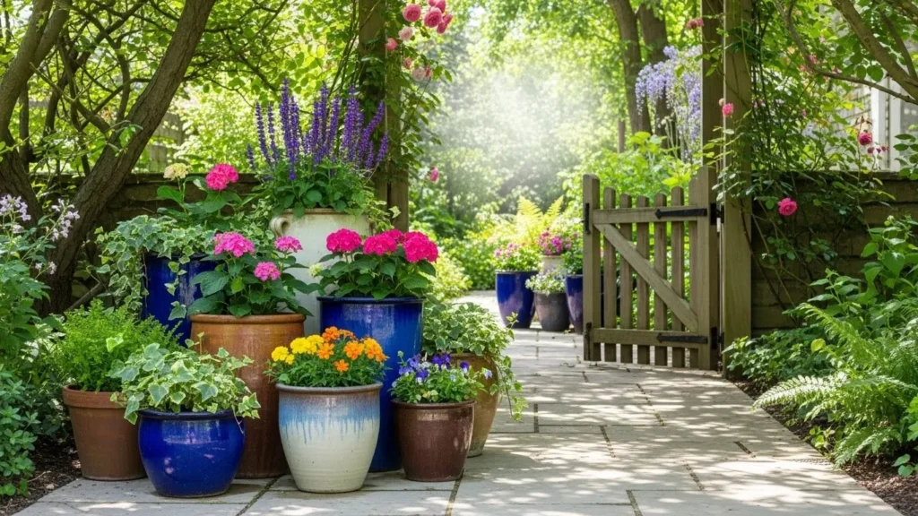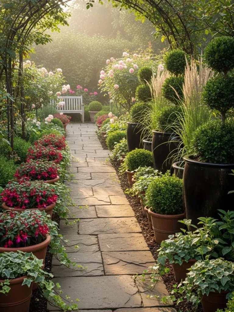When ground space is limited, vertical potscaping becomes a powerful tool. Tall plant stands, stacked clay pots, ladder shelves, and wall-mounted planters all raise your garden upward. The main advantage is that you’re not only saving space, but also introducing strong lines and height variations that make the area feel larger. Vertical containers are excellent for herbs, trailing plants, and colorful annuals that spill over the edges. They also allow you to showcase many plants without crowding your pathways.