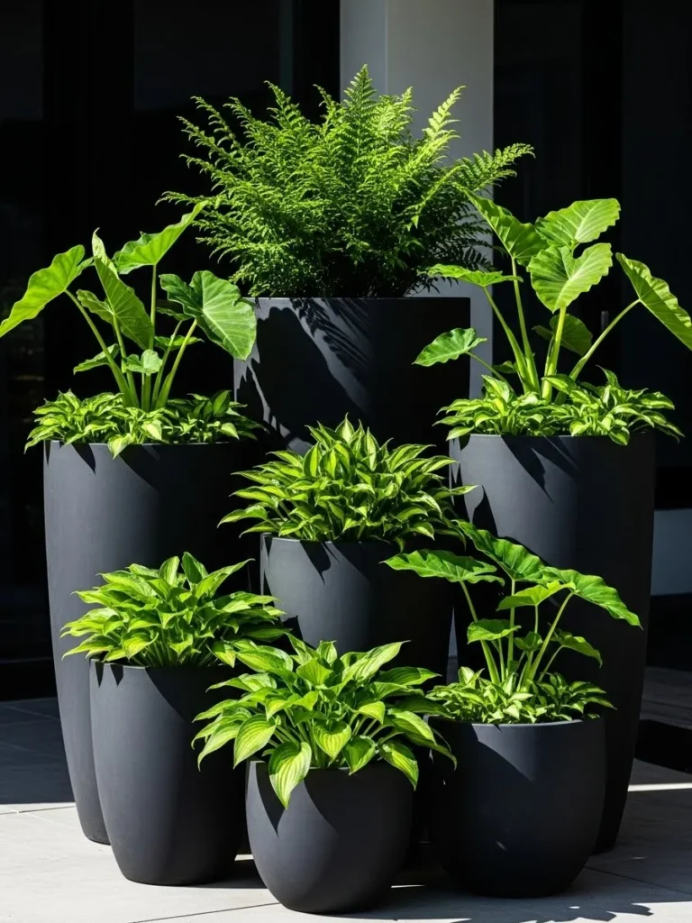 Dark pots, especially matte black or charcoal, create striking contrast with bright foliage or light-colored walls. They bring depth to the garden and work well in modern or urban spaces. The richness of dark containers makes greens appear more vibrant and helps anchor lighter elements. When placed among mixed materials like wood or stone, dark pots add a sense of sophistication without overwhelming the scene.